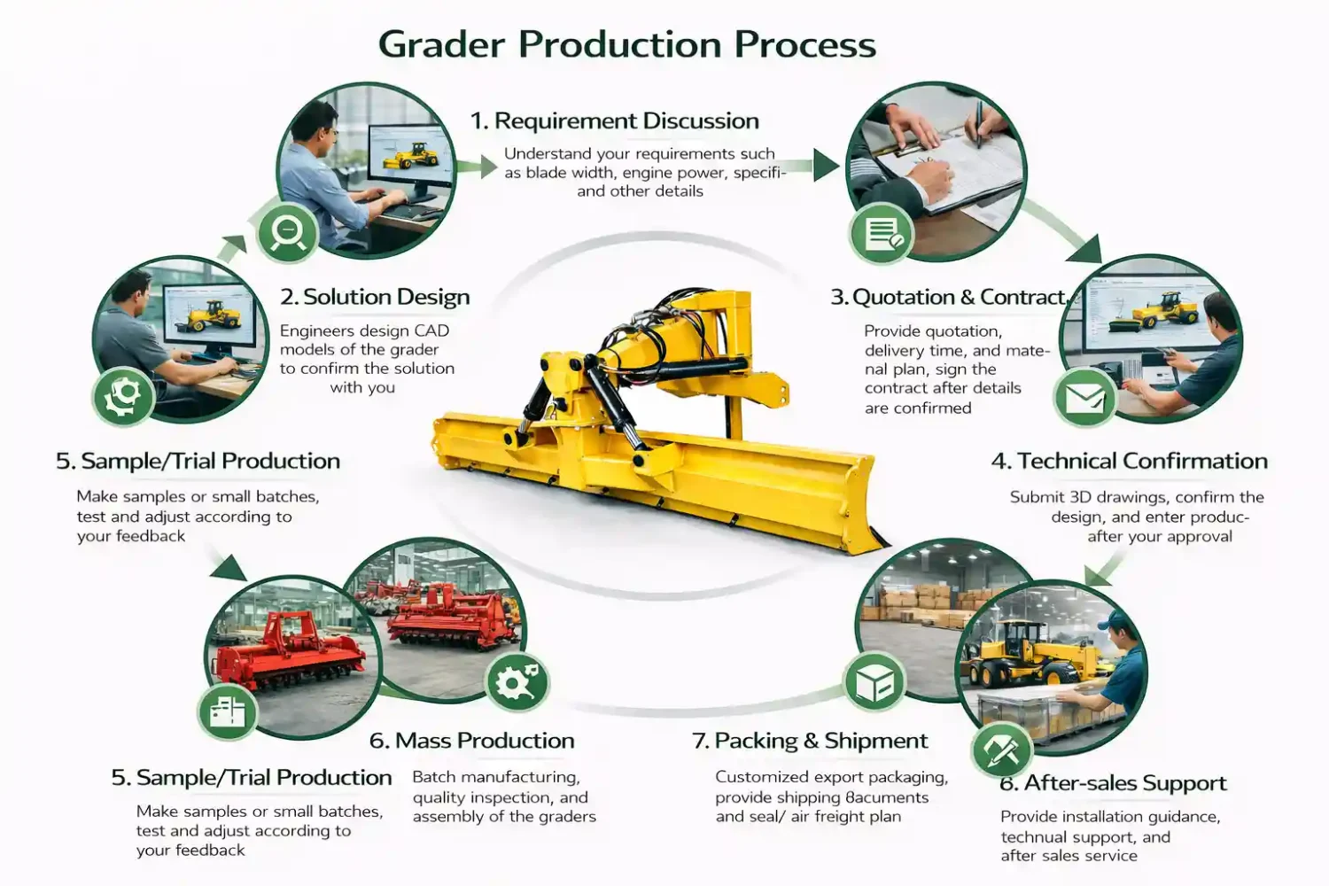 Equipped with a high-quality hydraulic system, the machine provides more precise adjustment, smoother control, and more reliable long-term performance. With proper use and maintenance, the grader is designed to offer a service life of more than 8 years, making it a durable solution for professional agricultural applications.